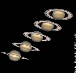 Dione, Tethys, Enceladus with its water jet, Mimas].